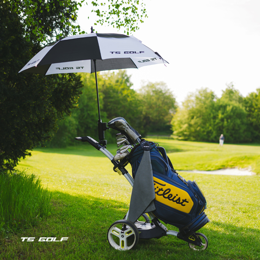 It fits directly onto Motocaddy's accessory station or any round-cylinder frame. The holder is durable, designed to withstand strong winds and rain, and can be easily folded for storage and transport. The umbrella securely slots in and stays in place with upgraded screws to keep you and your clubs dry.